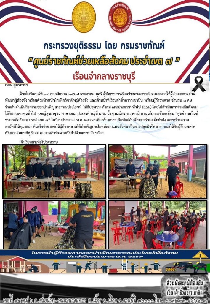 เรือนจำกลางราชบุรี โดยส่วนพัฒนาผู้ต้องขัง ได้นำผู้ต้องขังที่ผ่านการคัดเลือกจำนวน 3 คน ออกให้บริการตัดผมฟรีแก่ประชาชนตามโครงการ “ช่างอาสาสร้างสุข” เพื่อคืนประโยชน์แก่สังคมและเป็นการฝึกปฏิบัติงานจริงให้แก่ผู้ต้องขังที่เข้าร่วมโครงการพัฒนาพฤตินิสัยและฝึกทักษะอาชีพ