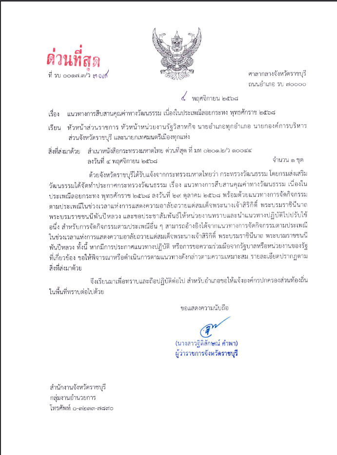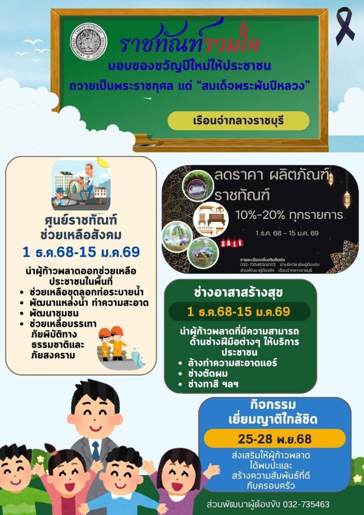 วันที่ 26 ตุลาคม ๒๕๖๘ เวลา นายอาคม ภูศรี ผู้บัญชาการเรือนจำกลางราชบุรี พร้อมเจ้าหน้าที่เรือนจำและผู้ต้องขัง ถวายความอาลัยแด่สมเด็จพระนางเจ้าสิริกิติ์ พระบรมราชินีนาถ พระบรมราชชนนีพันปีหลวง เพื่อน้อมรำลึกในพระมหากรุณาธิคุณ อันหาที่สุดมิได้ ณ อาคารสามัคคีพัฒนา แดน ๗ เรือนจำกลางราชบุรี